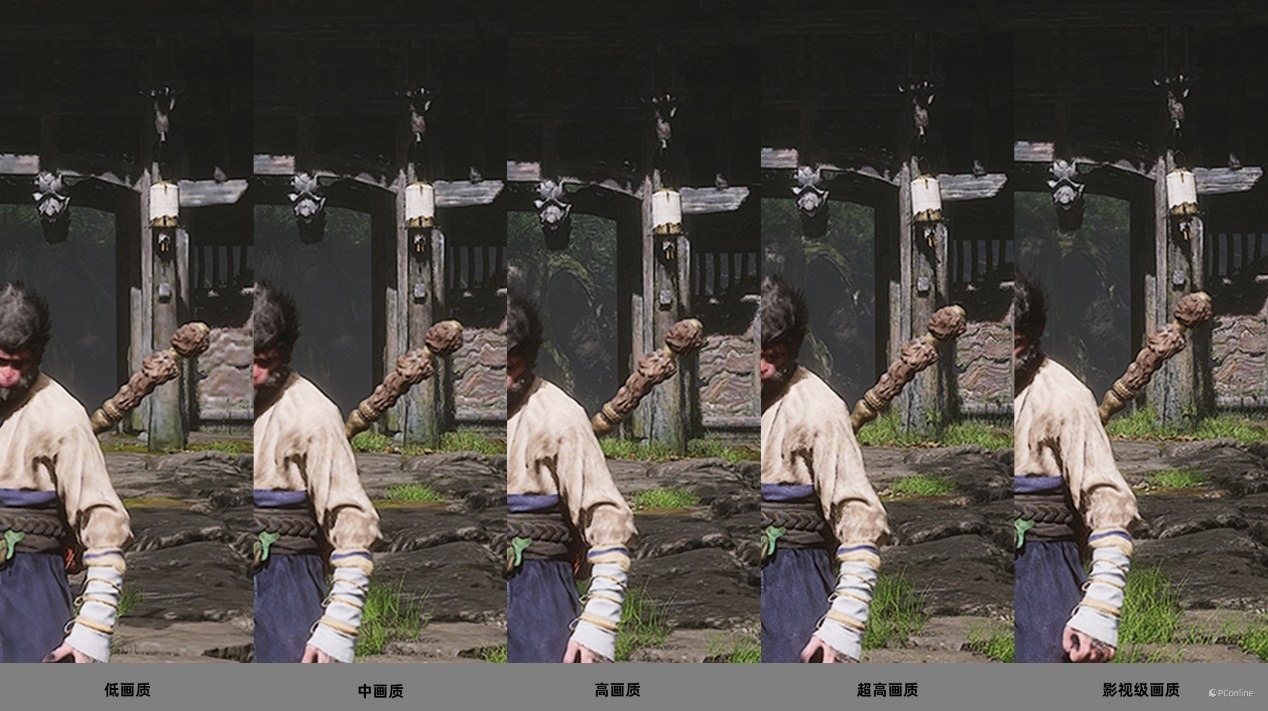 第一次听到“影视级画质”时还是又被震惊到,不过放大看细节以后,确实不得不佩服这个影视级画质的精细程度。例如看下图,低画质下,地面的植被少了不少,背后建筑的砖墙纹理也有些涂抹的感觉,而画质开到影视级以后,不仅地面石砖的纹理清晰,植被茂盛,就连天命人的衣服也多了不少真实世界里的褶皱与阴影。