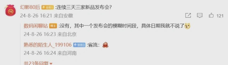 此外,博主在编辑微博时,配图为2024年10月的日历,其中14、15、16三个日期被特别标注。尽管有网友猜测这是否意味着连续三天的新品发布会,博主对此进行了否认,并暗示其中一个日期是某个发布会的模糊时间段,但具体日期并未透露。