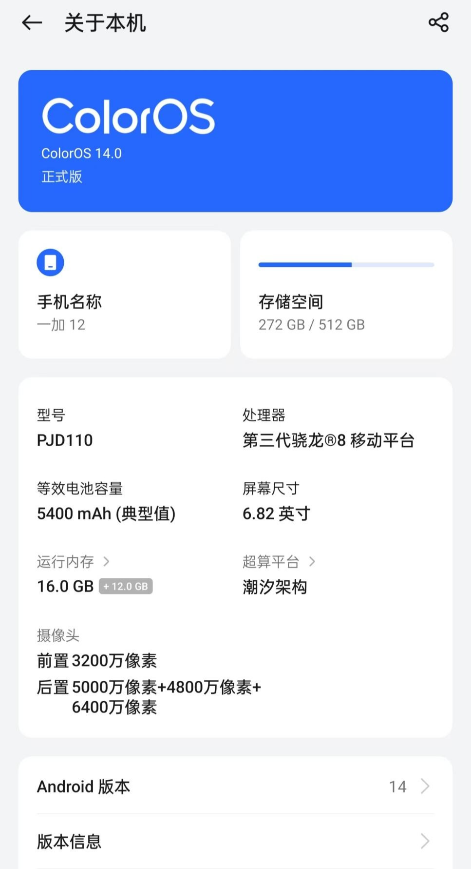 从泄露的截图中可以明显看出,ColorOS 15的界面设计相较于前代版本ColorOS 14有了显著的变化。顶部展示图将显示当前机型,而详情信息的布局则由之前的双列排布改为了单条信息横向排列,这一改动使得界面看起来更加简洁和直观。