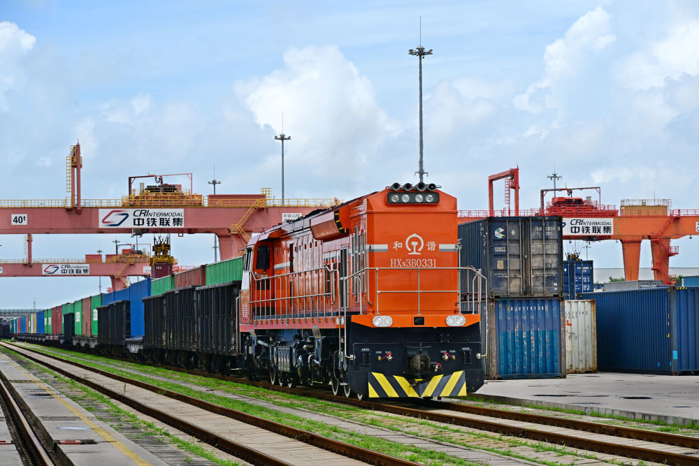 一列“中欧班列”从上合示范区多式联运中心发车(7月26日摄)。新华社记者李紫恒 摄