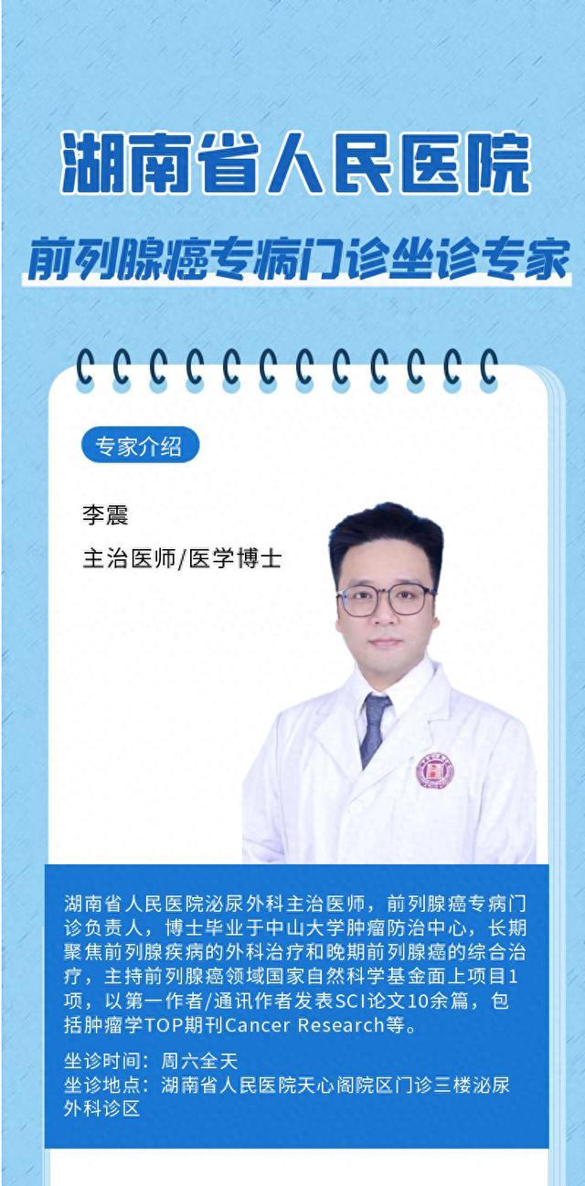 基于以上考虑,在周一至周五开设省医名医专家门诊(祖雄兵教授)、特需专家门诊(李远伟主任等)之外,湖南省人民医院泌尿外科将于2024年9月起,开设前列腺癌专病门诊,由前列腺癌全程管理专家李震博士主诊。