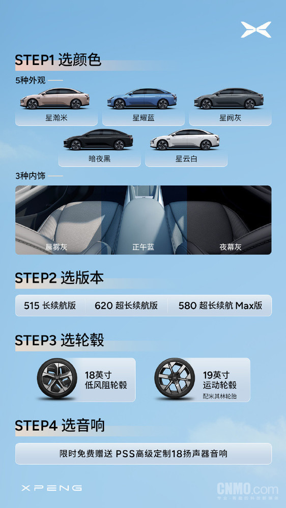 选购的话也比较简单,小鹏汽车表示只需要四步就可以轻松搞定。首先是选颜色,MONA M03有5种外观:星瀚米、星耀蓝、星阙灰、暗夜黑和星云白,还有3种内饰:晨雾灰、正午蓝和夜幕灰。