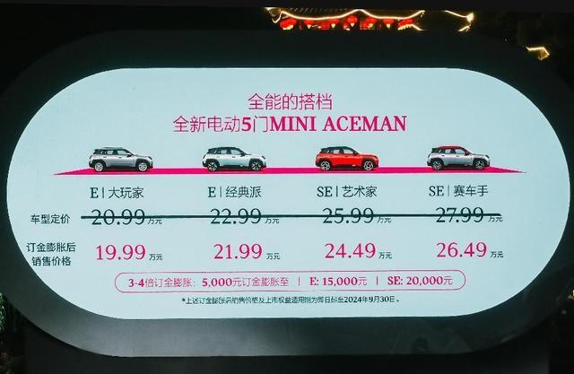 全新电动MINI Aceman充分发扬MINI品牌的创新精神,在仅4米左右的车身长度内采用5门5座全新结构,全新电动MINI Aceman同样提供4个车款,分别为大玩家、经典派、艺术家和赛车手,售价相应为19.99万元、21.99万元、24.49万元和26.49万元(此价格为订金膨胀后销售价格,有效期为即日起至2024年9月30日(含))。