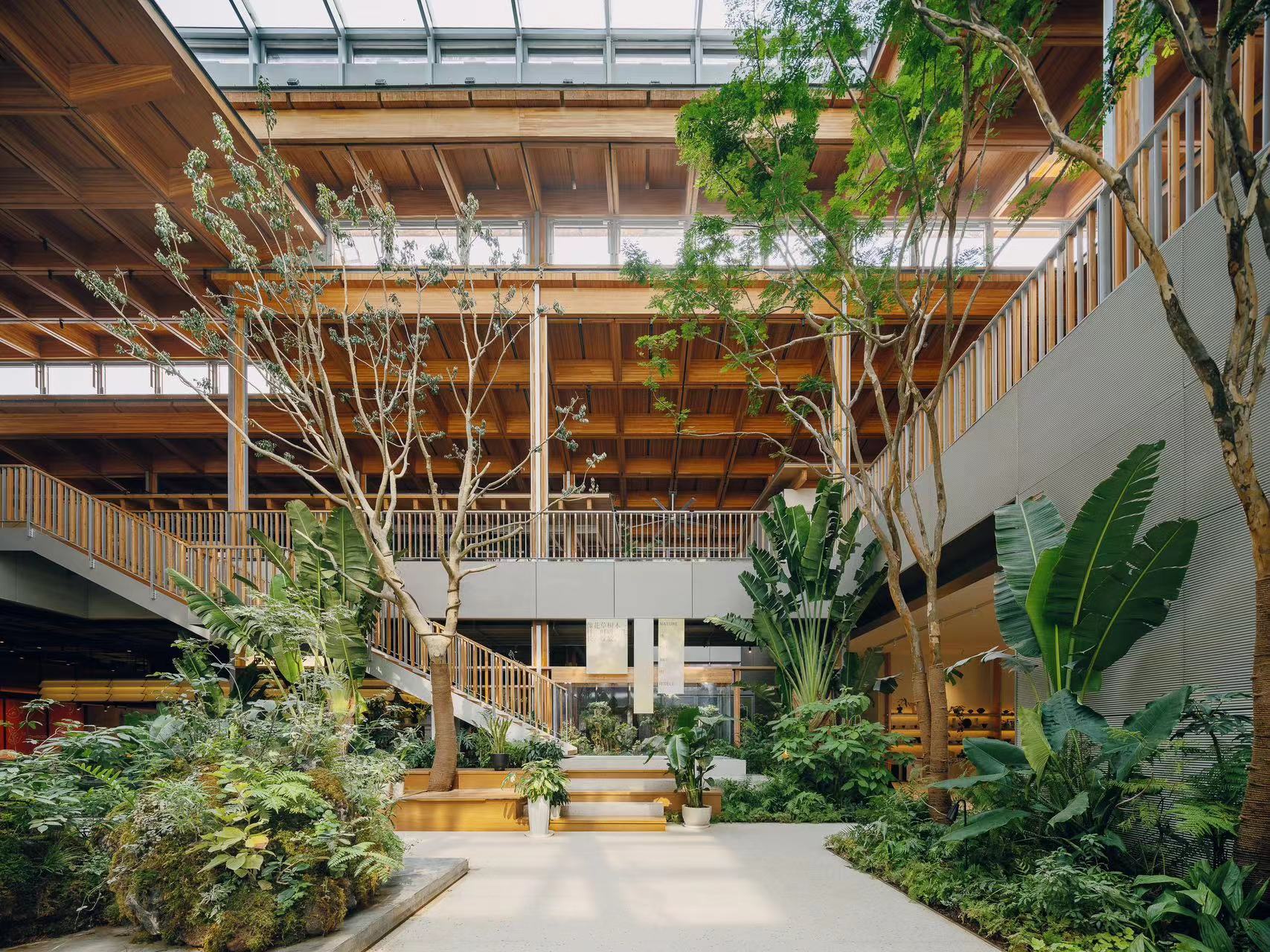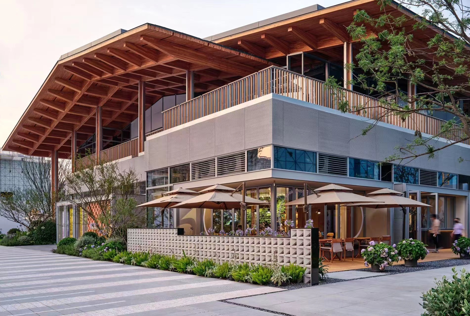 要说上海嘉定理想之地项目智慧建造集大成者,春熙集肯定榜上有名。步入市集,你能看到市集屋面覆盖着特殊的“遮阳伞”——光伏板、以温润的木材平衡冷峻现代的金属,以及垂直绿化、阳台绿化、地面绿化形成多层次的绿化空间,三维生态空间诗意满满。