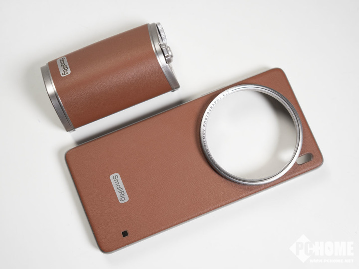 我们先来看看外观,该套装是由保护壳和手柄两部分组成,保护壳就是个标准的素皮手机壳,右下角有一个方形卡扣凹槽,镜头边缘的刻度盘保护圈是可拆卸设计,方便搭配各种滤镜使用。