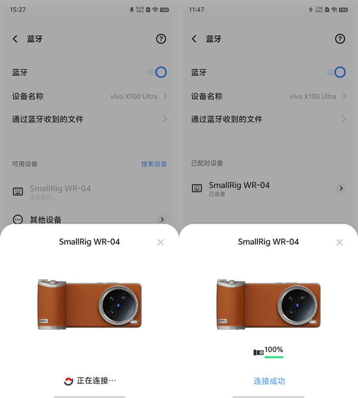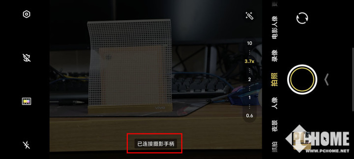 手柄在使用时,需要先与手机建立蓝牙连接,vivo在这里进行了专门适配,连接时会有非常醒目的大图提示。首次使用时,在进入相机后,会提示手柄申请权限,也会有连接手柄的提示消息。需要注意的是,手柄就是单纯的手柄功能,不能当充电宝使用。