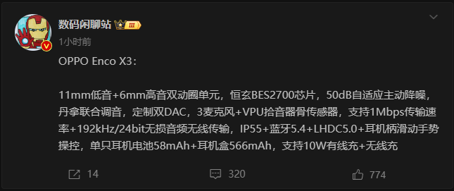 OPPO Enco X3 将配备3 麦克风+ VPU 拾音骨传感器,通话质量相比前代更好。搭载11mm 低音+ 6mm 高音双单元,丹拿联合调音,搭配 1Mbps 传输的速率 和 192kHz / 24bit 无损音频,能获得更好的音质表现。