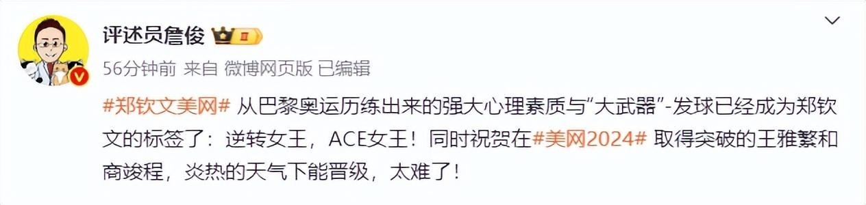 评论员詹俊对郑钦文、王雅繁、商竣程三人表现点赞:“从巴黎奥运历练出来的强大心理素质与‘大武器’,发球已经成为郑钦文的标签了:逆转女王,ACE女王!同时祝贺取得突破的王雅繁和商竣程,炎热的天气下能晋级,太难了。”