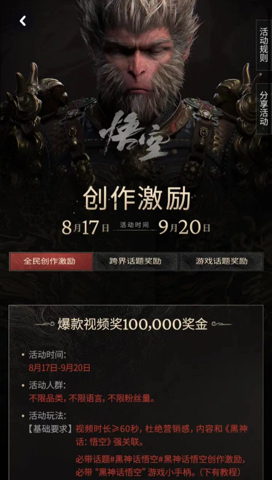 而短视频平台的收获来得更加“简单粗暴”。平台为《黑神话》的到来做了充足准备,抖音游戏举办了速通大赛,玩家 72 小时内直播通关就能获得 1000 元,第一名在抖音直播通关的玩家能拿到 10 万元激励。最终世界顶级玩家E1uM4y在直播中以5小时5分钟的成绩最快通关。