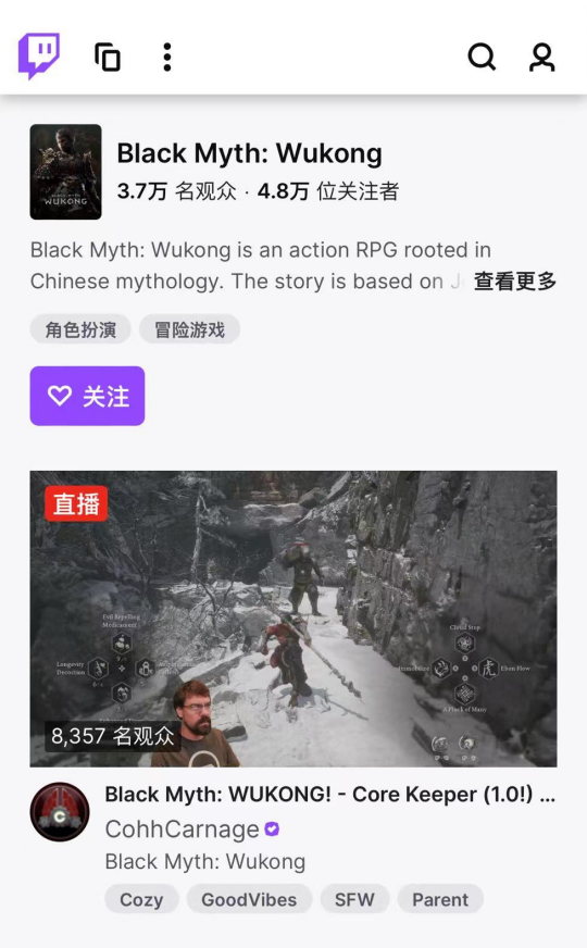 而海外最大游戏直播平台Twitch上,也诠释着何为“没日没夜”的黑神话。(美国时间晚10点),约有5万名在线观众围观《黑神话:悟空》相关直播,而美国时间早9点,仍有超3.7万名观众围观《黑神话:悟空》游戏直播。