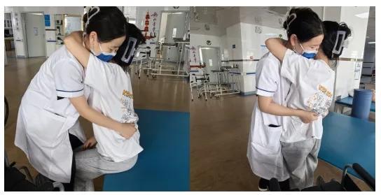 ③患者健侧的手环绕家属或陪护的脖子,家属或陪护则拉住患者的腰带,帮助患者将重心移到脚上,臀部离开轮椅并站稳。