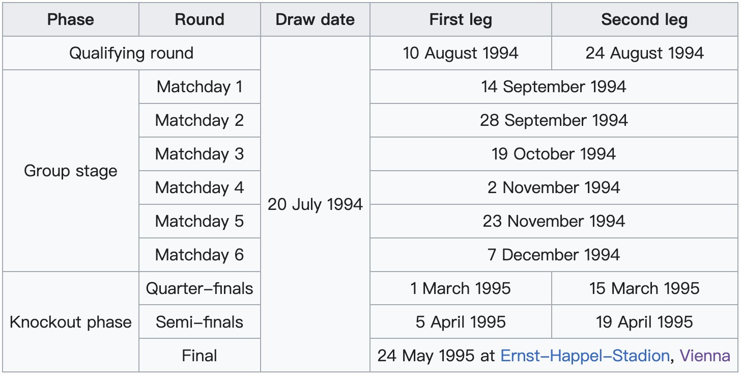 1995-96赛季欧冠沿袭了此赛制,重大变化是小组赛阶段引入了取胜一场积3分的规则。