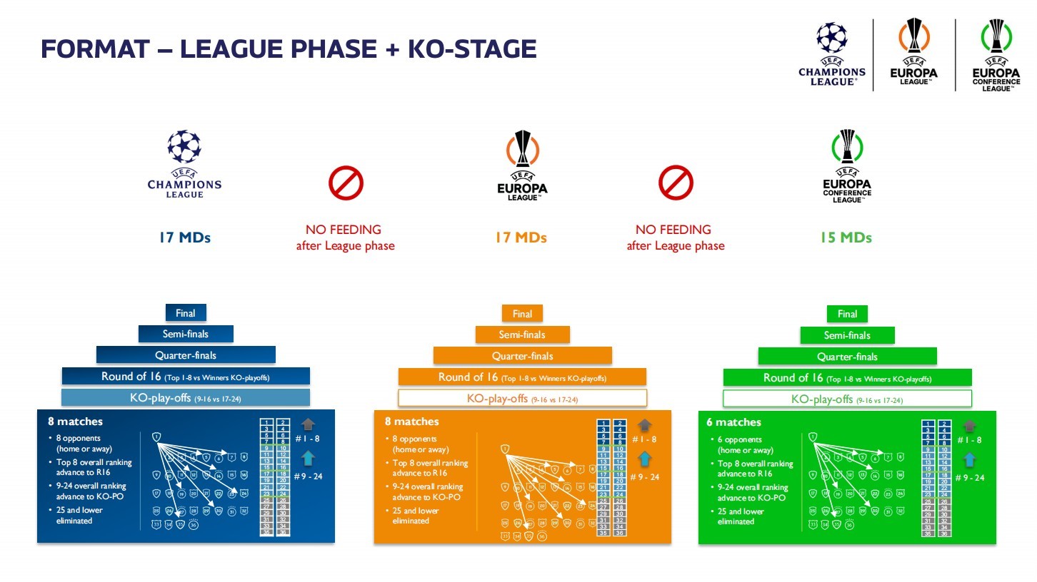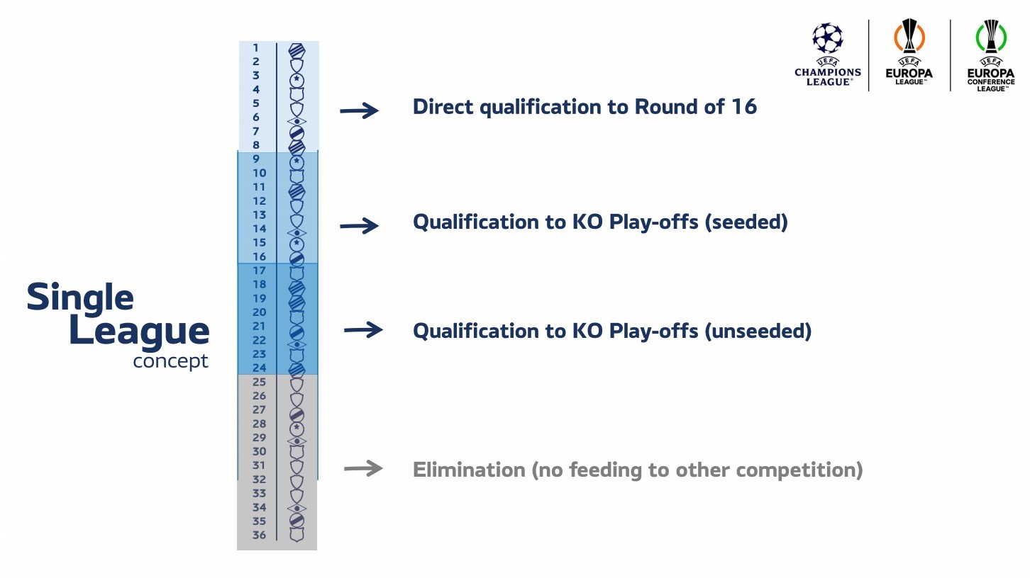 每支球队与八支球队进行八场比赛,36支球队统一进行排名。8轮联赛后,前8名球队直通十六强,9-24名的16支球队进行两回合的附加赛,争夺其他8个十六强席位。然后,才是我们熟悉的两回合1/8决赛、两回合1/4决赛、两回合半决赛和单回合决赛。