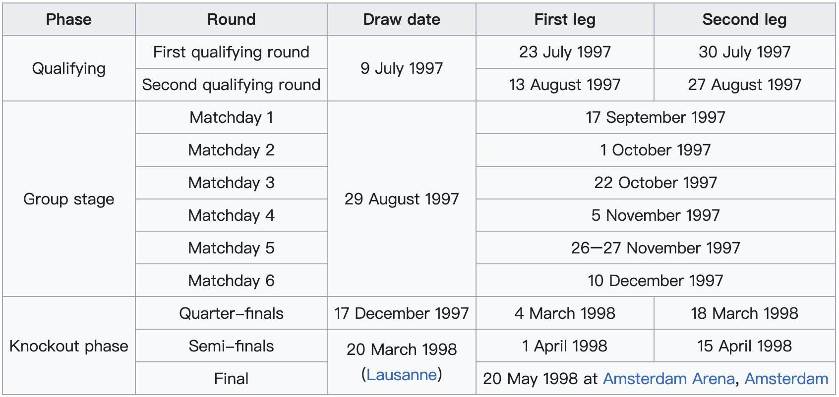 1997-98赛季欧冠发生了重大变革:首先,欧冠参赛球队不再限定联赛冠军和卫冕冠军,联赛亚军也可以参加;其次,欧冠首次出现两轮资格赛,最终进入正赛的球队扩军至24支;第三,小国冠军回到欧冠,参赛总球队从24支扩加到55支。
