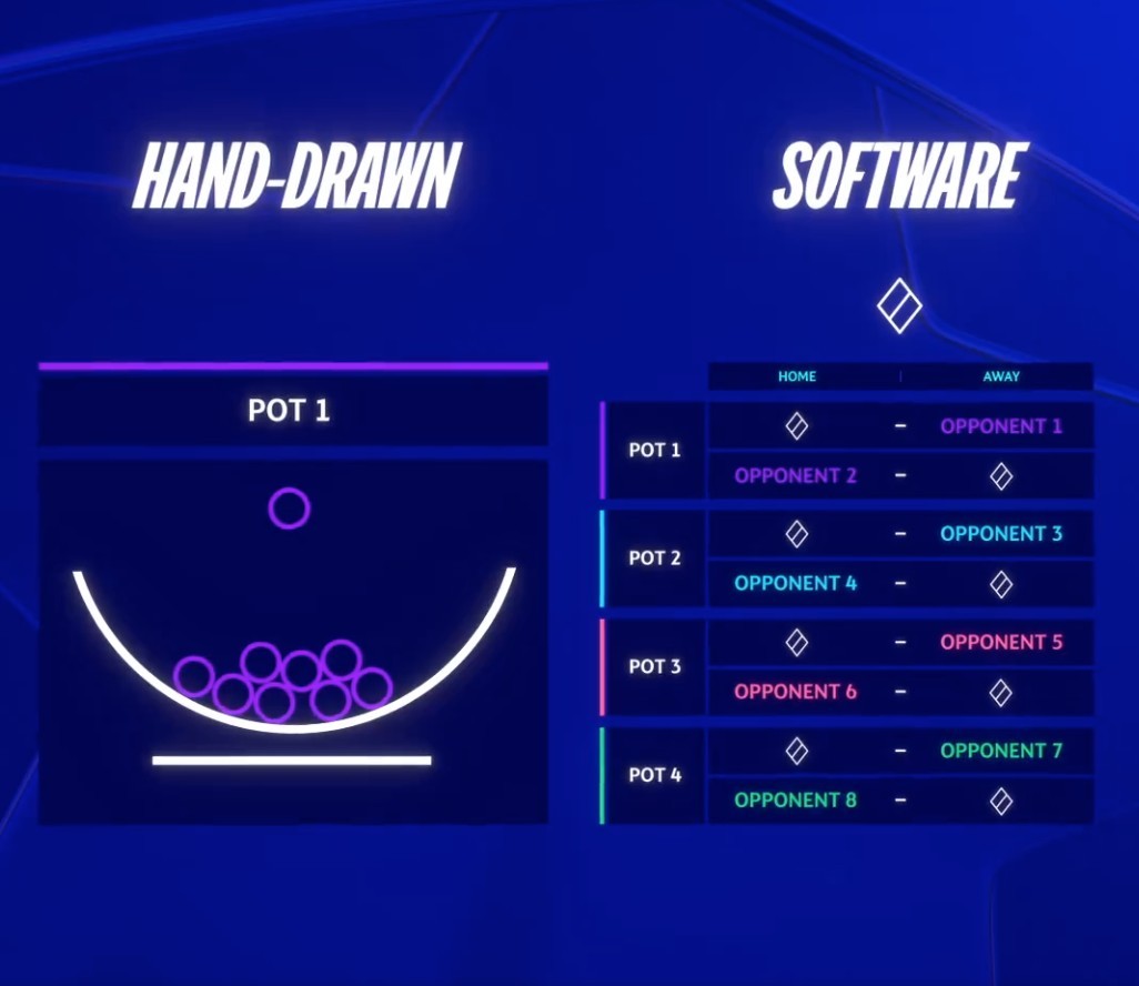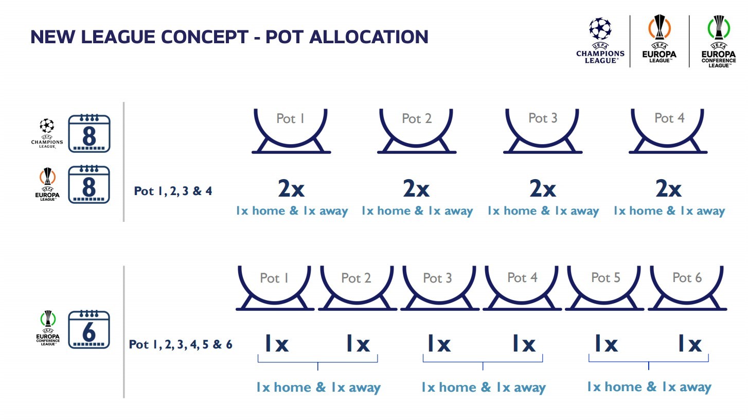 欧冠「联赛阶段」的赛制,是每支球队在四个分档里各抽取两支球队,并分别进行四主四客的比赛,小组赛阶段的双杀概念将不复存在。在抽签过程中,同协会回避原则依然存在,一支球队对阵其他同协会的球队最多只能是两支。