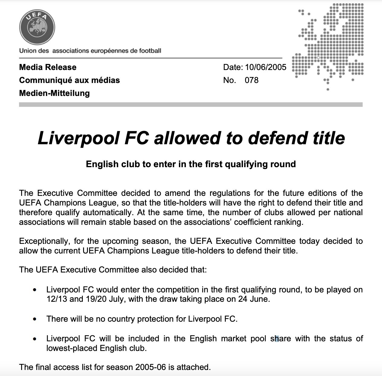 05-06赛季,欧冠卫冕冠军利物浦由于在联赛只排名第五,被欧足联特别增加了一个席位,他们从资格赛第一轮开始踢,历经6场才进入正赛。从此,欧足联为卫冕冠军确保了一个小组赛席位,无论其联赛排名。埃弗顿止步资格赛第三轮,让英超无缘成为首个五支球队参加欧冠正赛的联赛。