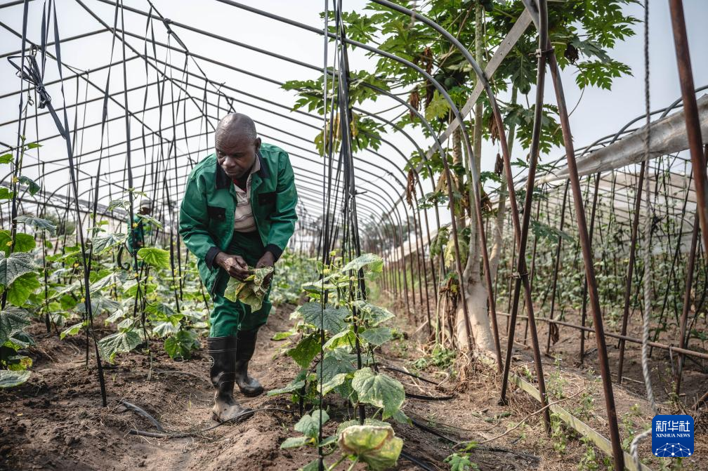8月3日,在刚果(布)首都布拉柴维尔的中国援刚果(布)农业技术示范中心内,当地员工在大棚内查看黄瓜长势。