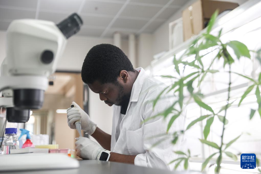 7月17日,尼日利亚留学生格雷戈里在中国热带农业科学院三亚研究院开展木薯虫害绿色防控研究实验。