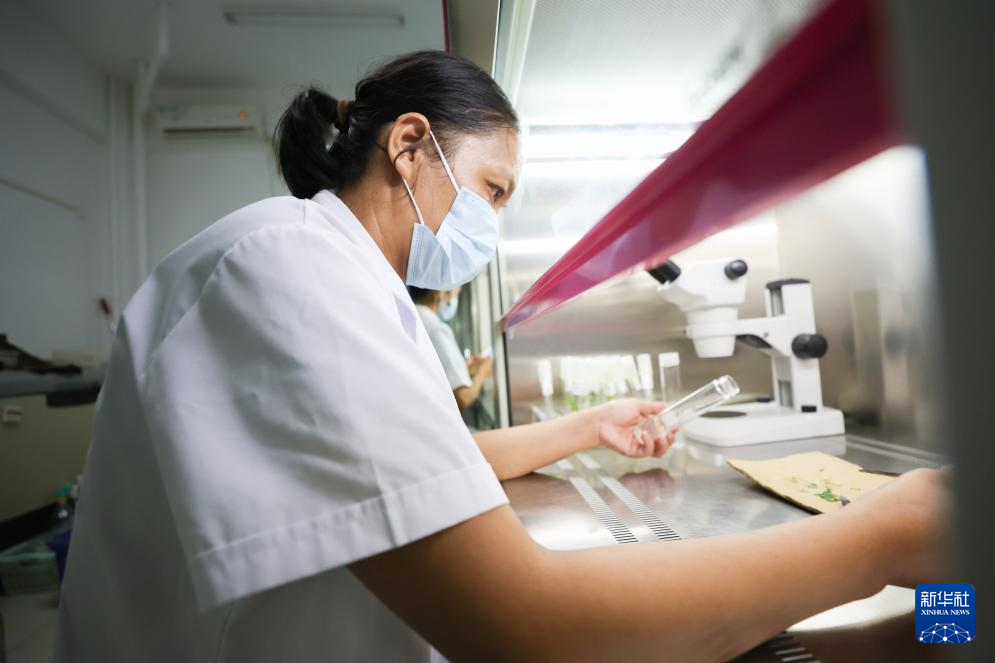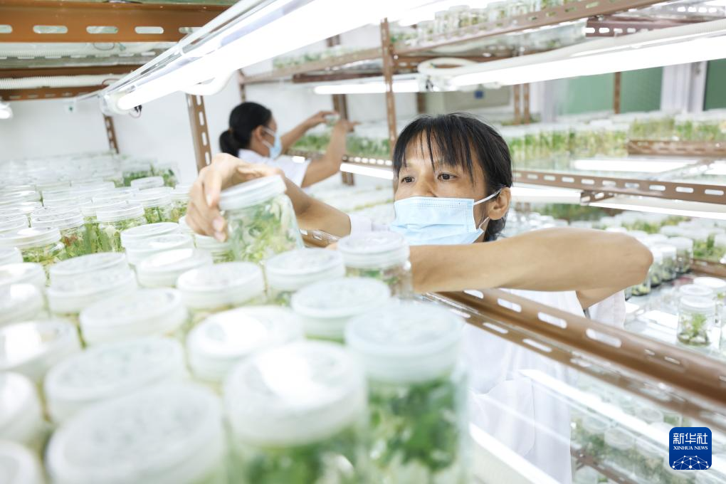 7月10日,在中国热带农业科学院儋州院区的一间实验室,科研人员做木薯继代培养工作。