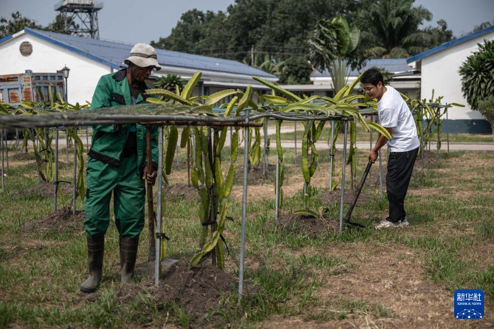 8月3日,在刚果(布)首都布拉柴维尔的中国援刚果(布)农业技术示范中心内,中方农业专家李科明(右)与当地员工为火龙果浇水、松土。