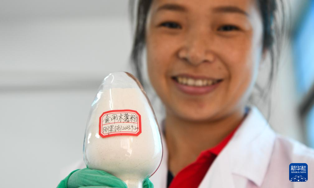 2023年11月13日,科研人员在位于海南儋州的中国热带农业科学院热带作物品种资源研究所实验室展示从中国援刚果(布)农业技术示范中心寄回来的木薯粉。