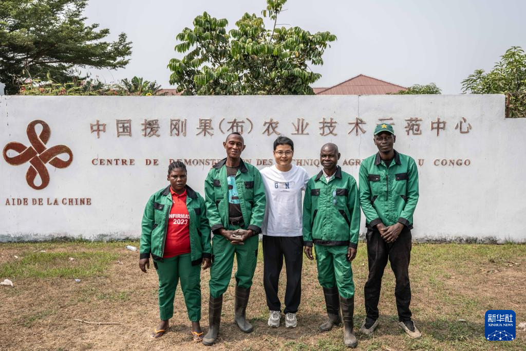 8月3日,在刚果(布)首都布拉柴维尔的中国援刚果(布)农业技术示范中心外,中方农业专家李科明(中)与当地员工合影。