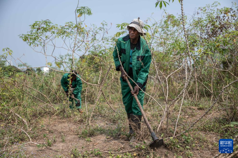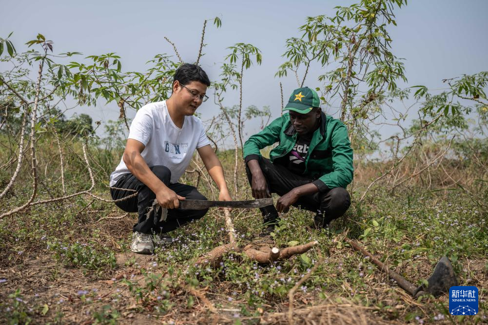 8月3日,在刚果(布)首都布拉柴维尔的中国援刚果(布)农业技术示范中心内,中方农业专家李科明(左)与当地员工一起收获木薯。