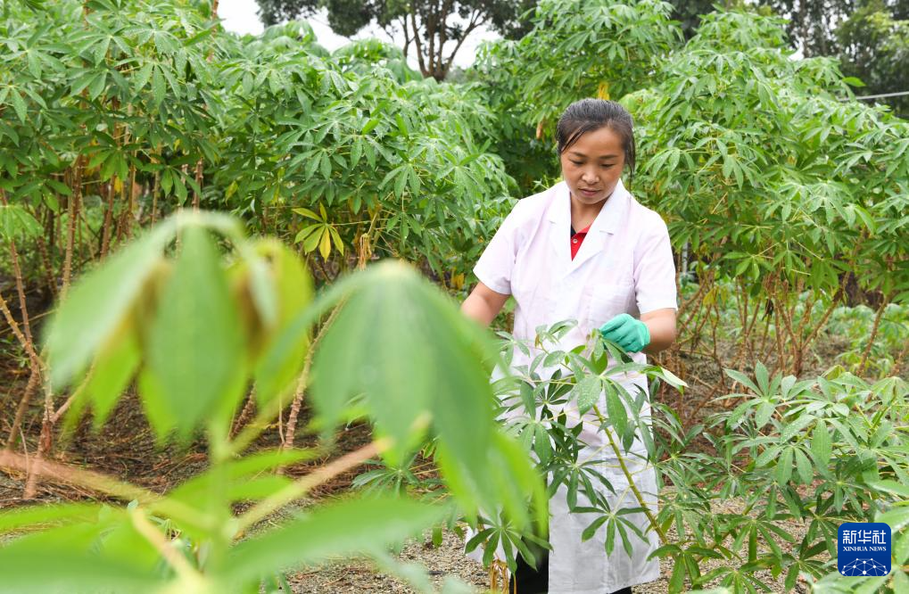 2023年11月13日,中国热带农业科学院科研人员在位于海南儋州的国家木薯种质资源圃查看木薯生长情况。