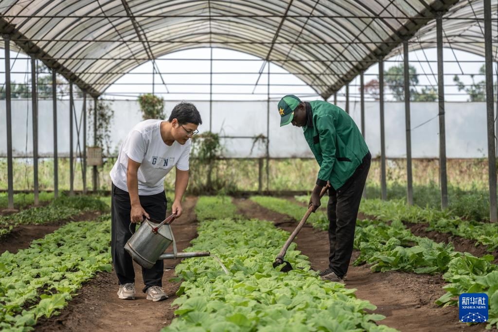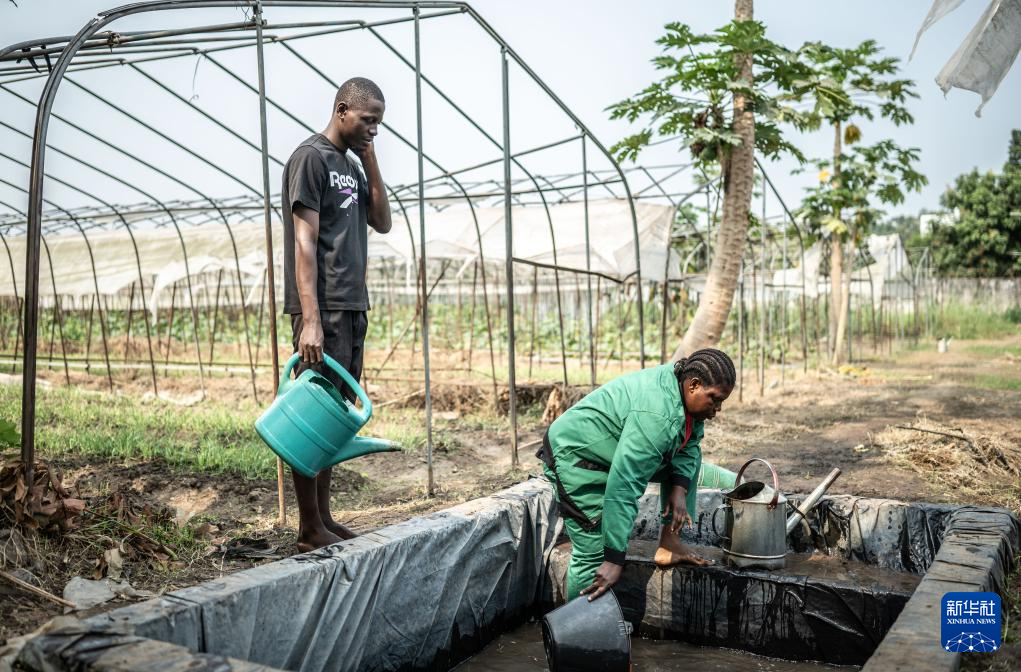 8月3日,在刚果(布)首都布拉柴维尔的中国援刚果(布)农业技术示范中心内,中方农业专家李科明(左)与当地员工在大棚内耕作。