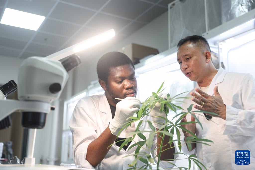 7月17日,在中国热带农业科学院三亚研究院内,二级研究员陈青(右)指导尼日利亚留学生格雷戈里开展木薯虫害绿色防控研究实验。