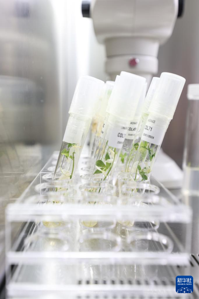 7月10日,在中国热带农业科学院儋州院区的一间实验室,科研人员观察木薯组培苗。