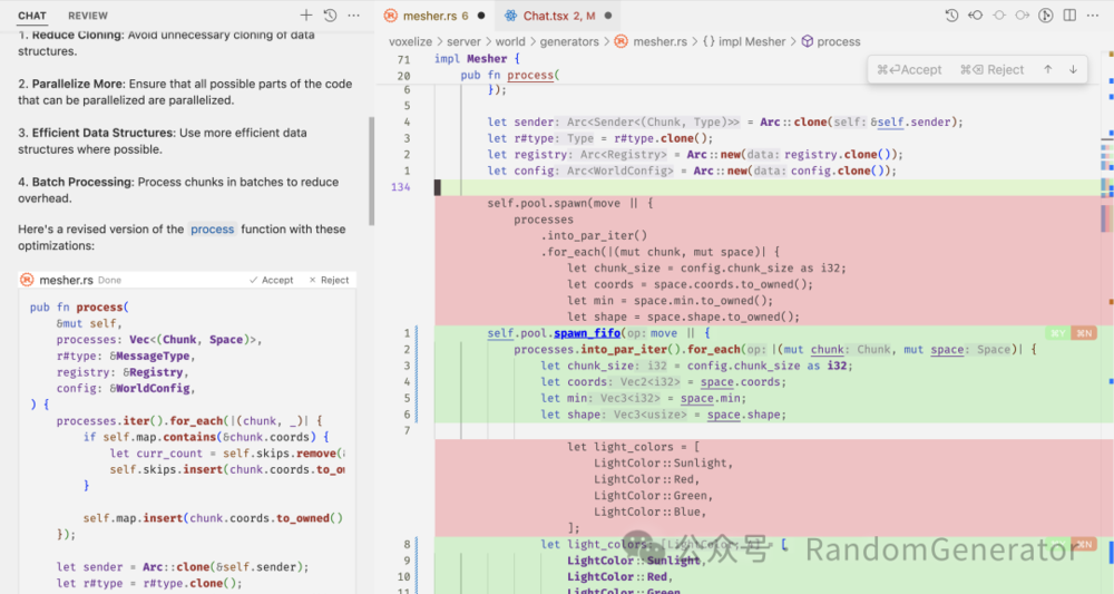 以前面使用 devv 等 AI 搜索工具的流程为例,现在我可以在 Cursor 中打开 Chat,发出相关需求,Cursor 在完成响应后,会直接生成一个“pull request”,我们可以直接在编辑器中看到各个改动。然后就跟 code review 一样,可以提各种修改和后续要求,也可以部分接受改动后,再对剩下的进行进一步沟通等。这比我们从网站上再把代码拷贝回来修改来说,体验要好上不少。这个交互形式也与 Cursor Tab 里生成编辑内容的理念非常一致。