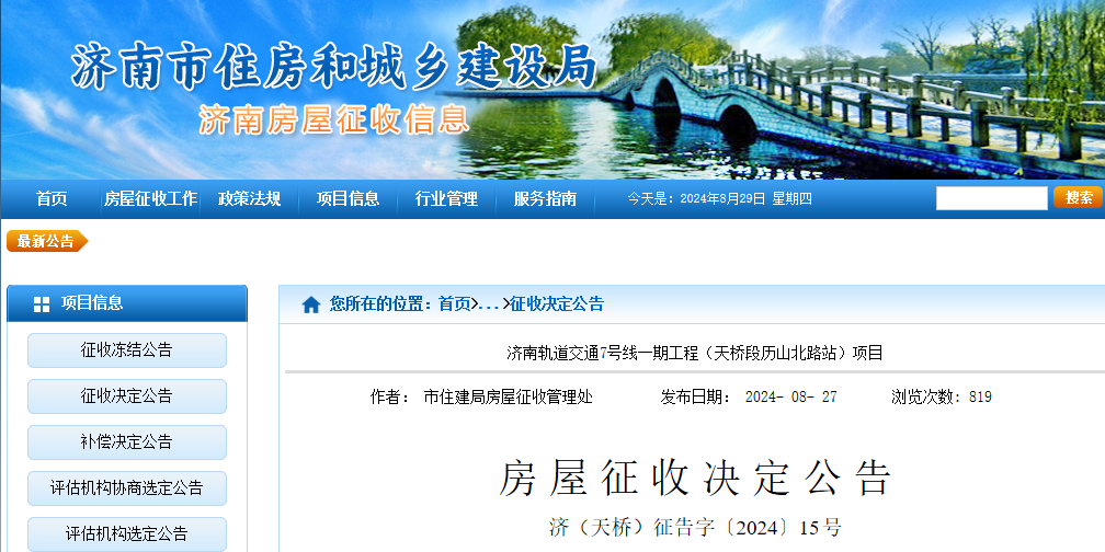 8月27日,济南市天桥区人民政府依法作出济南轨道交通7号线一期工程(天桥段历山北路站)项目房屋征收决定。有关事项公告如下: