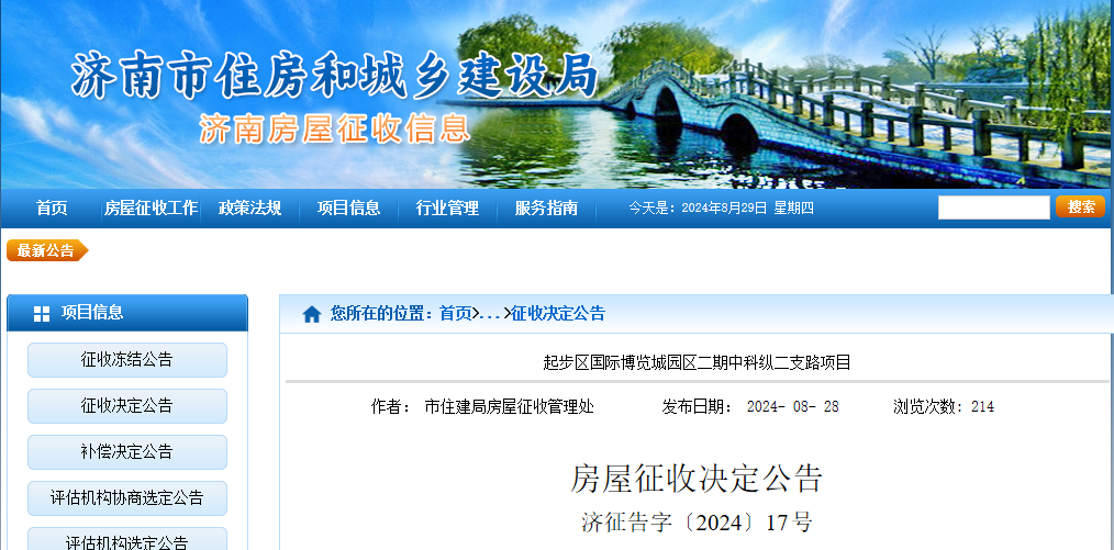 8月28日,济南市人民政府已作出济征字〔2024〕17号房屋征收决定,对起步区国际博览城园区二期中科纵二支路项目国有土地上房屋实施征收。有关事项公告如下: