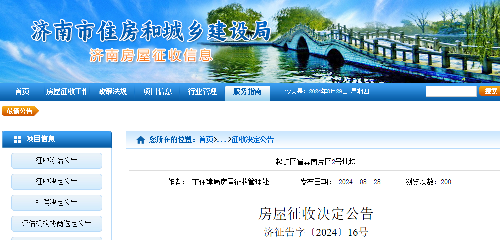 8月28日,济南市人民政府已作出济征字〔2024〕16号房屋征收决定,对起步区崔寨南片区2号地块国有土地上房屋实施征收。有关事项公告如下: