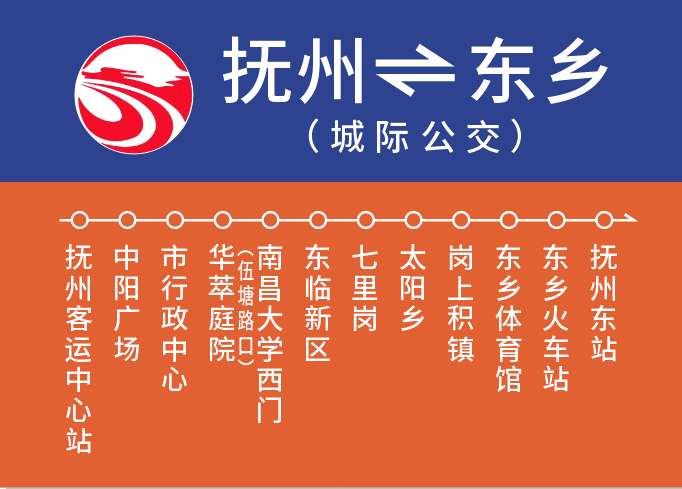 抚州客运中心站—中阳广场—抚州市行政中心—华萃庭院(伍塘路口)—南昌大学抚州医学分院(南大西门)—东临新区—七里岗—太阳乡—岗上积镇—东乡体育馆(铁路桥下)—东乡火车站—抚州东站。