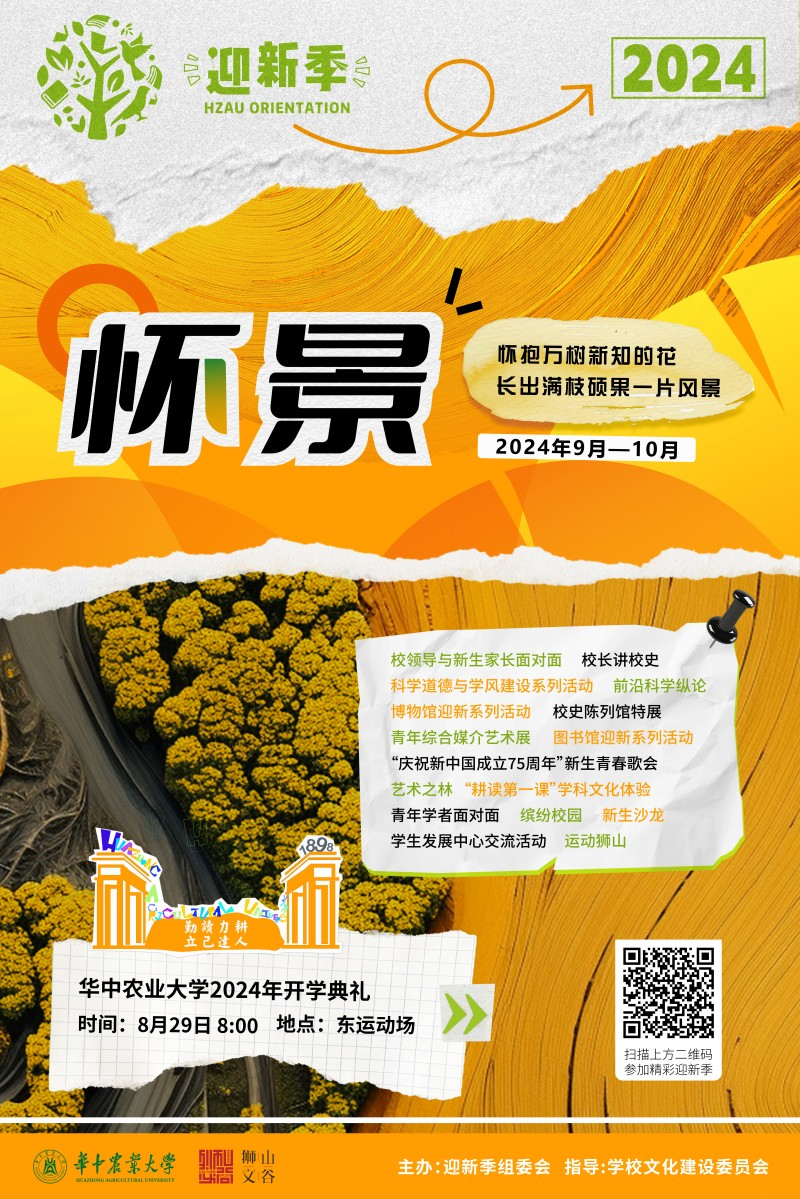 据海报介绍,华中农业大学推出的“2024年迎新季系列文化活动”将持续至10月,包括“校长讲校史”“科学道德与学风建设系列活动”“‘庆祝新中国成立75周年’新生青春歌会”“前沿科学纵论”等活动。