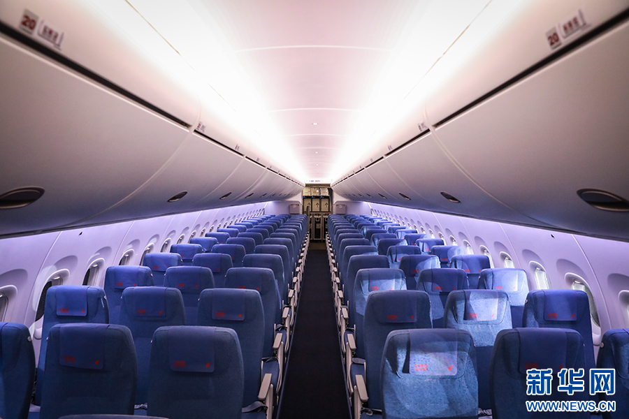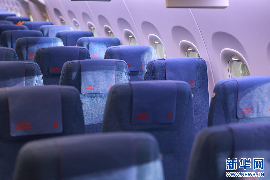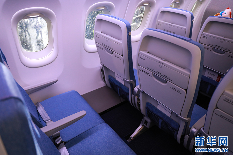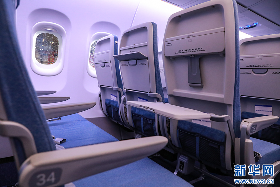 经济舱座位前后间距为30-31英寸,是目前已交付的C919机型中最为宽松的经济舱。新华网 陈延特摄