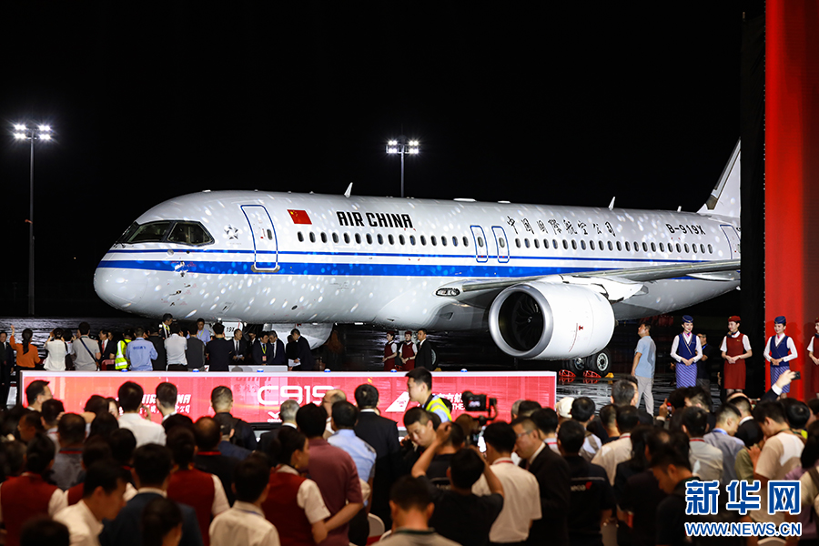 8月28日,首架载旗C919飞机正式揭幕亮相。国航首架引进机型为C919-ER延程型机型,拥有更大的最大起飞重量(78.9吨)和发动机推力(30000磅),可实现航程更远,满载飞行距离为2000海里,最大航程为5小时,较基本型分别增加700海里和1.7小时,具备更好的市场适用性。新华网 陈延特摄