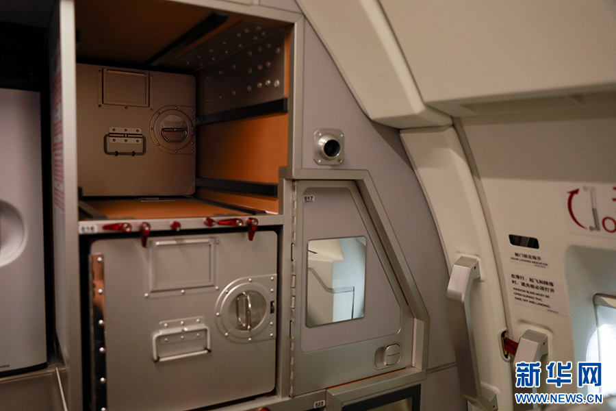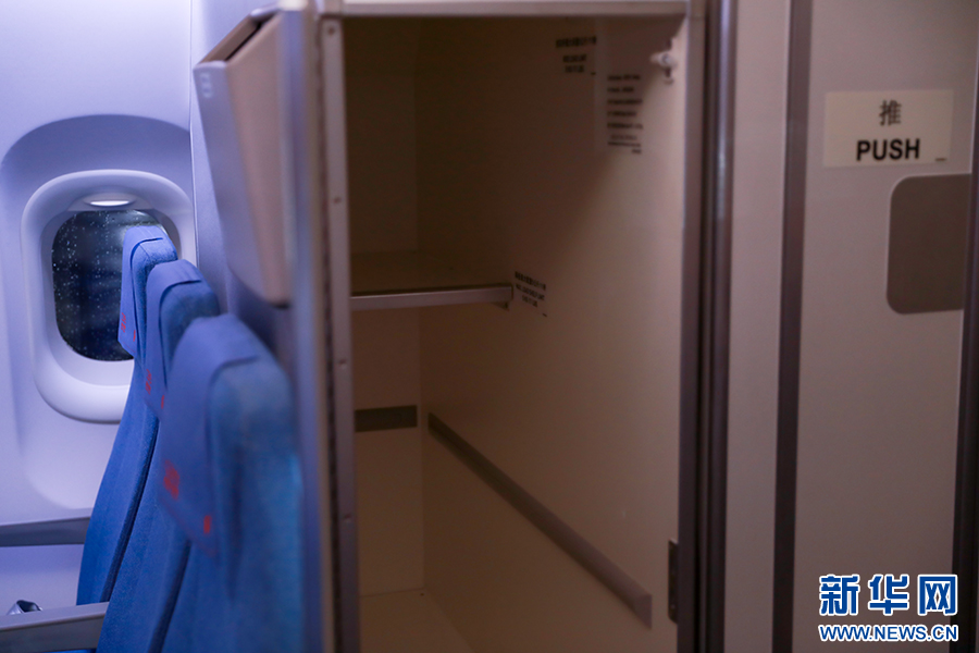 客舱前后分别设计了衣帽储存空间,同时与应急物品、设施做了分隔。新华网 陈延特摄