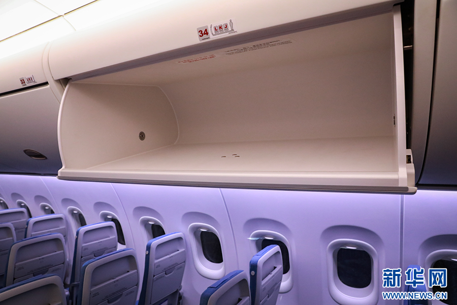 机舱内行李架展示。据透露行李架后续机型将进一步优化扩大储存空间。新华网 陈延特摄
