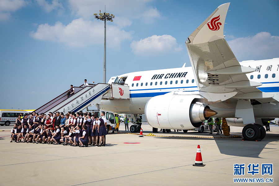 国航飞行总队于5月21日正式组建第七大队——C919机队。首批10名C919飞行员于7月29日完成转机型训练。现场机组人员顺利落地北京合影。新华网 陈延特摄
