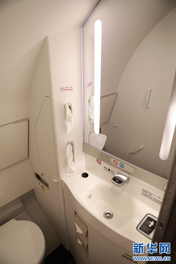 机上共有3个卫生间,均设计了设置了婴儿护理台和残疾人扶手,在镜灯上也做了更为明亮的设计。新华网 陈延特摄