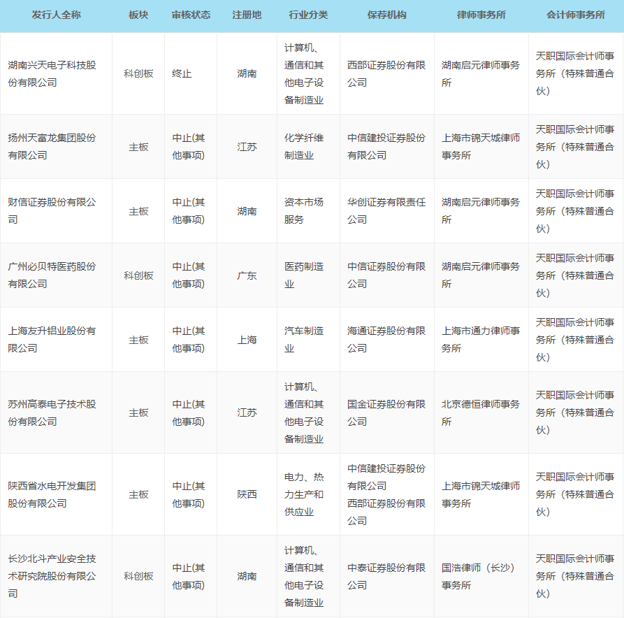 此外,发行上市板块为科创板的湖南兴天电子科技股份有限公司项目,目前审核状态为终止。
