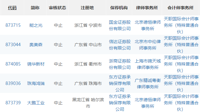 北交所方面,天职国际的5个项目审核状态更新为中止,分别为能之光(873715)、奥美森(873044)、锦华新材(874085)、珠海鸿瑞(839036)、大鹏工业(873739)。
