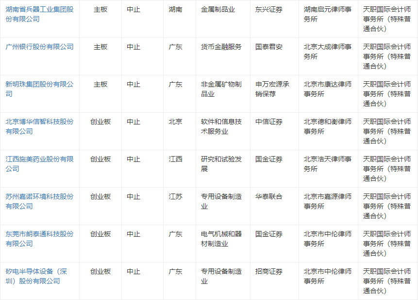 深交所官网显示,目前审核状态更新为中止的天职国际项目,IPO方面共有8家。其中,主板项目有3个,分别为湖南省兵器工业集团股份有限公司、广州银行股份有限公司、新明珠集团股份有限公司。