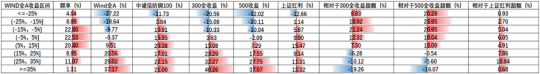 统计在市场不同行情下防御型100指数相较于300全收益、500全收益的超额对比情况如下所示。