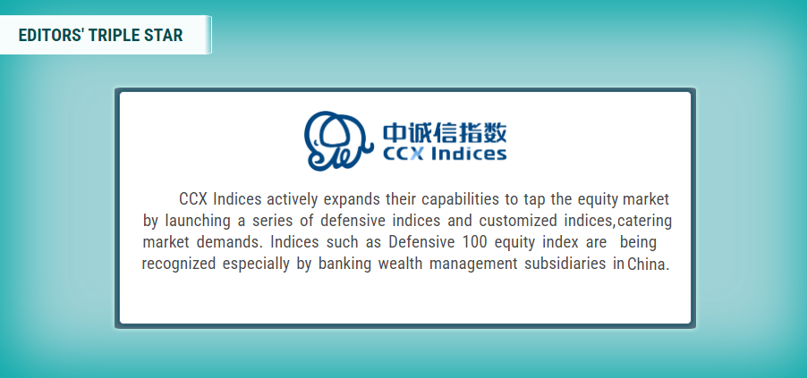 近日,《财资》杂志评价道:“中诚信指数积极探索股票市场,推出了一系列防御性指数和定制化指数,精准捕捉市场需求。其推出的防御型100股票指数尤其受到中国商业银行理财子公司的高度认可,因而荣获【编辑评审团三星大奖】”。