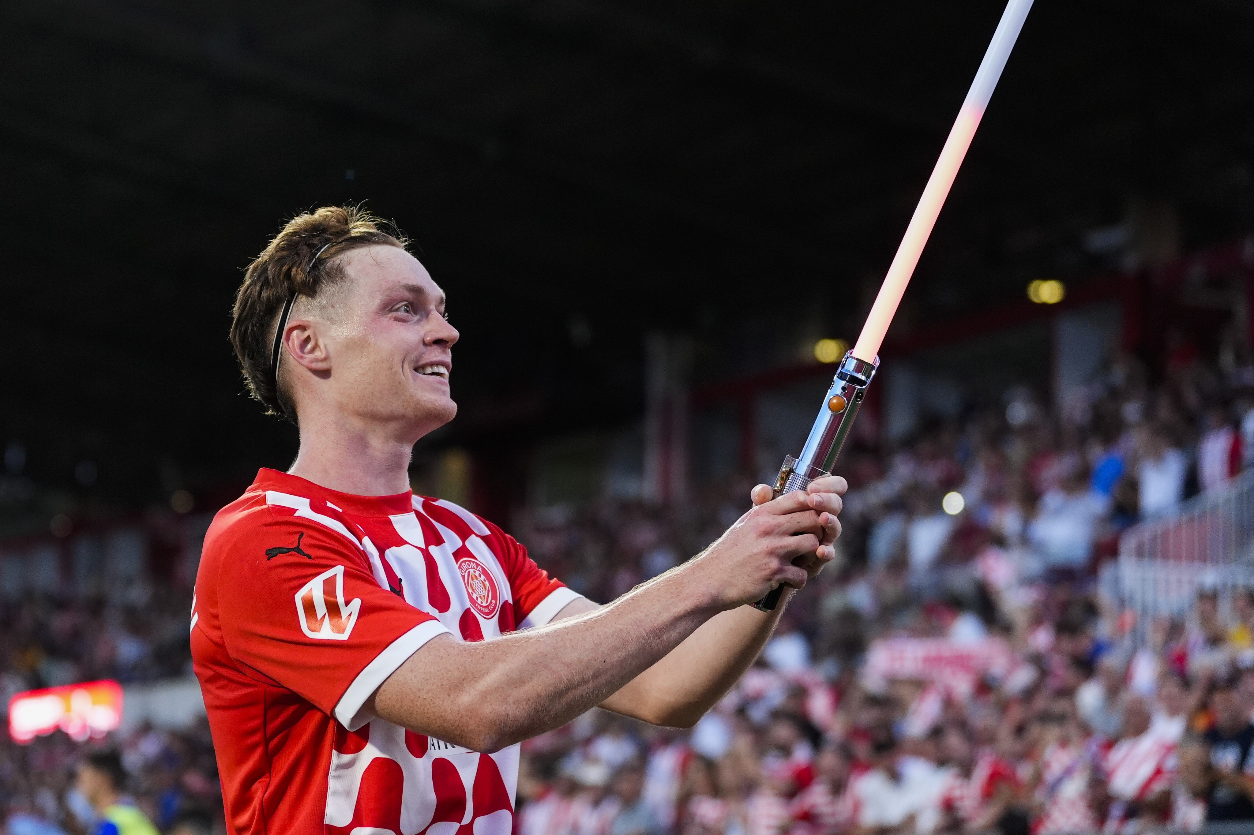 第53分钟,齐甘科夫打入一球,帮助赫罗纳2-0领先奥萨苏纳。他随后跑到场边拿出了电影《星球大战》的经典武器“光剑”摆出pose完成了庆祝。