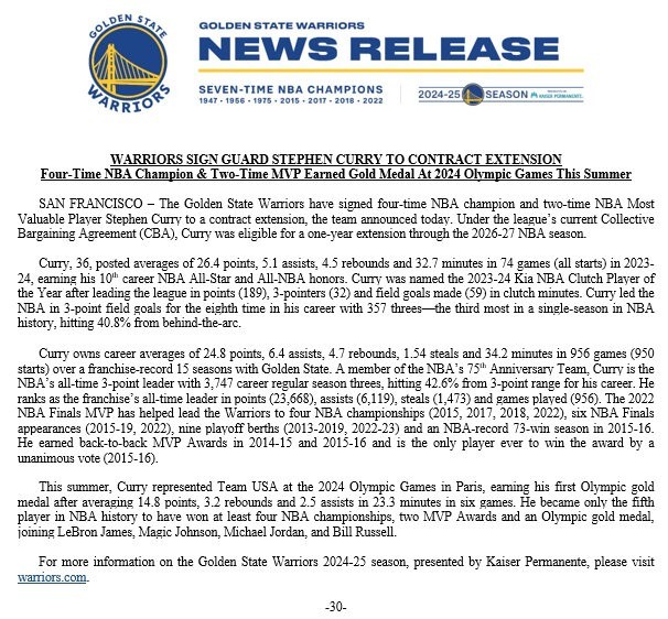 北京时间8月30日,NBA勇士队官方宣布,球队与功勋球员斯蒂芬-库里提前续约至26/27赛季,届时库里将年满39岁。